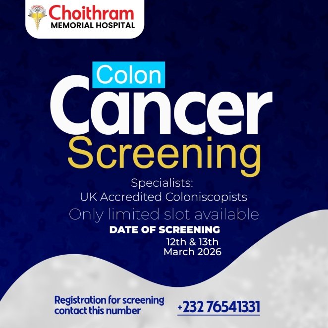 Choithram Memorial Hospital has announced a special two-day colon cancer screening programme scheduled for 12th and 13th March 2026, bringing a team of United Kingdom–accredited colonoscopy specialists to Freetown as part of ongoing efforts to promote early detection and prevention of colorectal cancer.