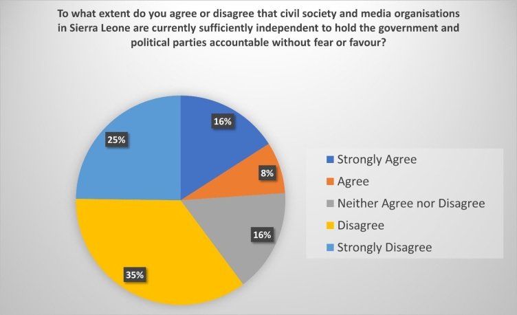 According to the poll, a significant majority of respondents expressed doubt about the ability of media and Civil Society Organizations to hold Government and political actors accountable without fear or favour. The data indicates that approximately six in ten citizens believe those institutions are not sufficiently independent, raising serious questions about the strength of democratic oversight in the country.