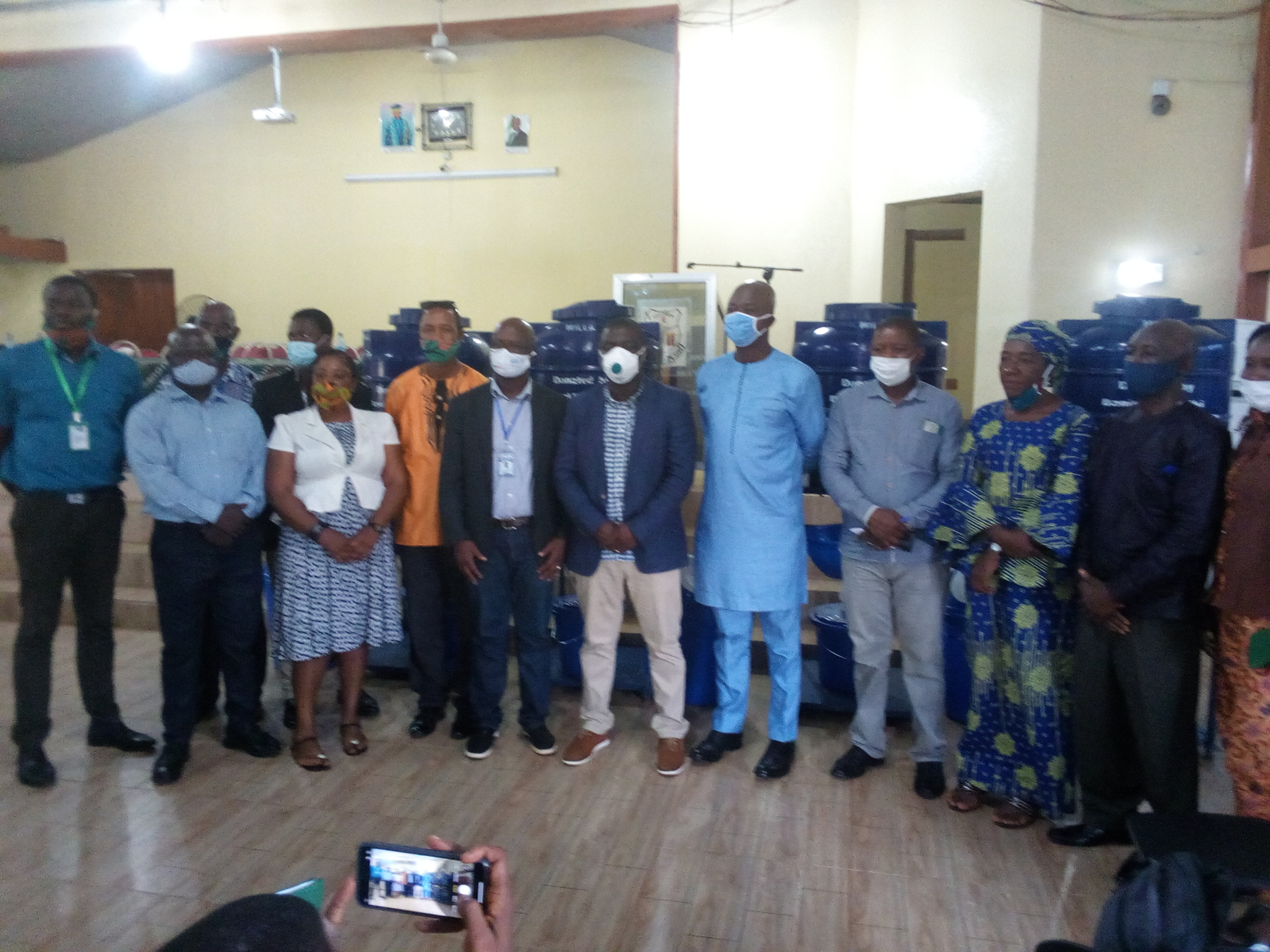 Daniel Kaitibi, the Director-General of the National Telecommunications Commission (NATCOM) on Wednesday 26th August 2020 donated 4 hand washing Milla water tanks, liquid soap, boxes of tissue and dustbins to the Milton Margai College of Education and Technology Polytechnic (MMCET) Goderich Campus at a ceremony held at the Great Hall of the campus.