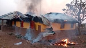 According to Abubakarr Conteh, Station Manager of Radio Bankhi-Solofaray FM 93.7, the fire that engulfed the station’s premises in Kukuna Town, Bramaia Chiefdom, Kambia District, completely consumed the building. He said the cause of the incident is still unknown and has not yet been confirmed by authorities.