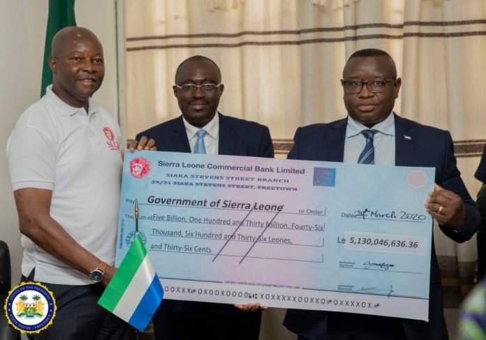 The leadership of the Sierra Leone Commercial Bank (SLCB) met with President Julius Maada Bio on 24 March 2020 at State House to present their 2018 dividend of Five Billion, One Hundred and Thirty Million, Forty-Six Thousand, Six Hundred and Thirty-Six Leones and Thirty-Six Cents (Le 5,130,046,636.36).